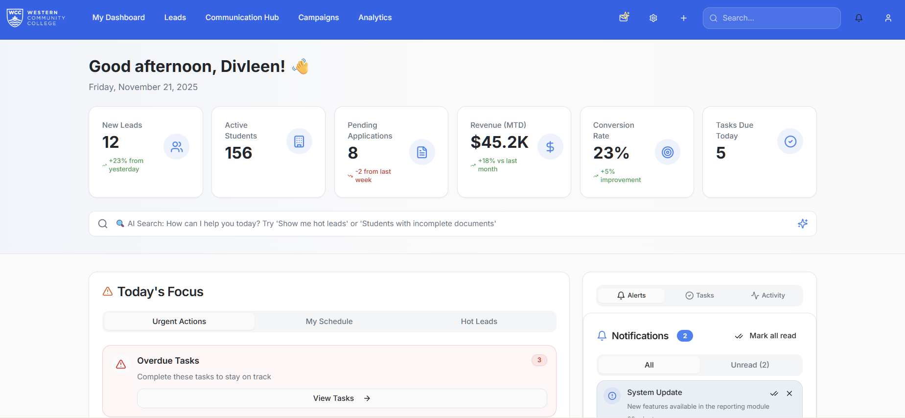 - As a complete admissions CRM — managing leads, communication, workflows, requirements, payments, documents, and analytics in one unified system. .